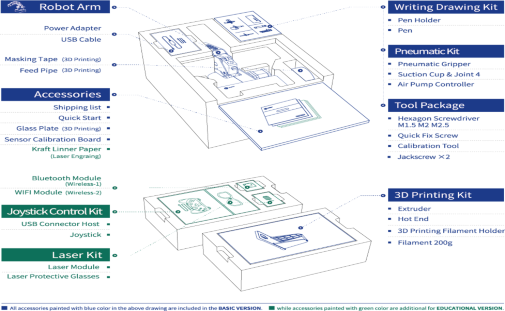 A DOBOT Magician Basic és a DOBOT Magician Edu gyakorlatilag megegyezőek, viszont a Magician Edu több kiegészítőt tartalmaz.